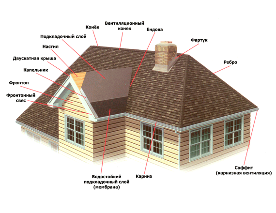 Ниже на схеме представлены основные элементы кровли из битумной черепицы, даны основные понятия.